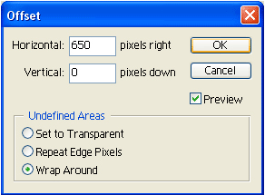 Now, eventually we are going to want to join the two sides together, to create a seemless edge. How do we do this? Have any ideas? Well, now that you have the picture open in Photoshop, we will offset the edges. Filter > Other > Offset (650 Pixels to the right, Wrap around)