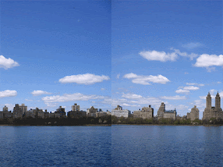 So, again with your clone stamp tool (and healing brush too) try and edit the clouds out in the red.. whilst keeping the middle line seemless. This is a bit tricky, and may take a couple of minutes...